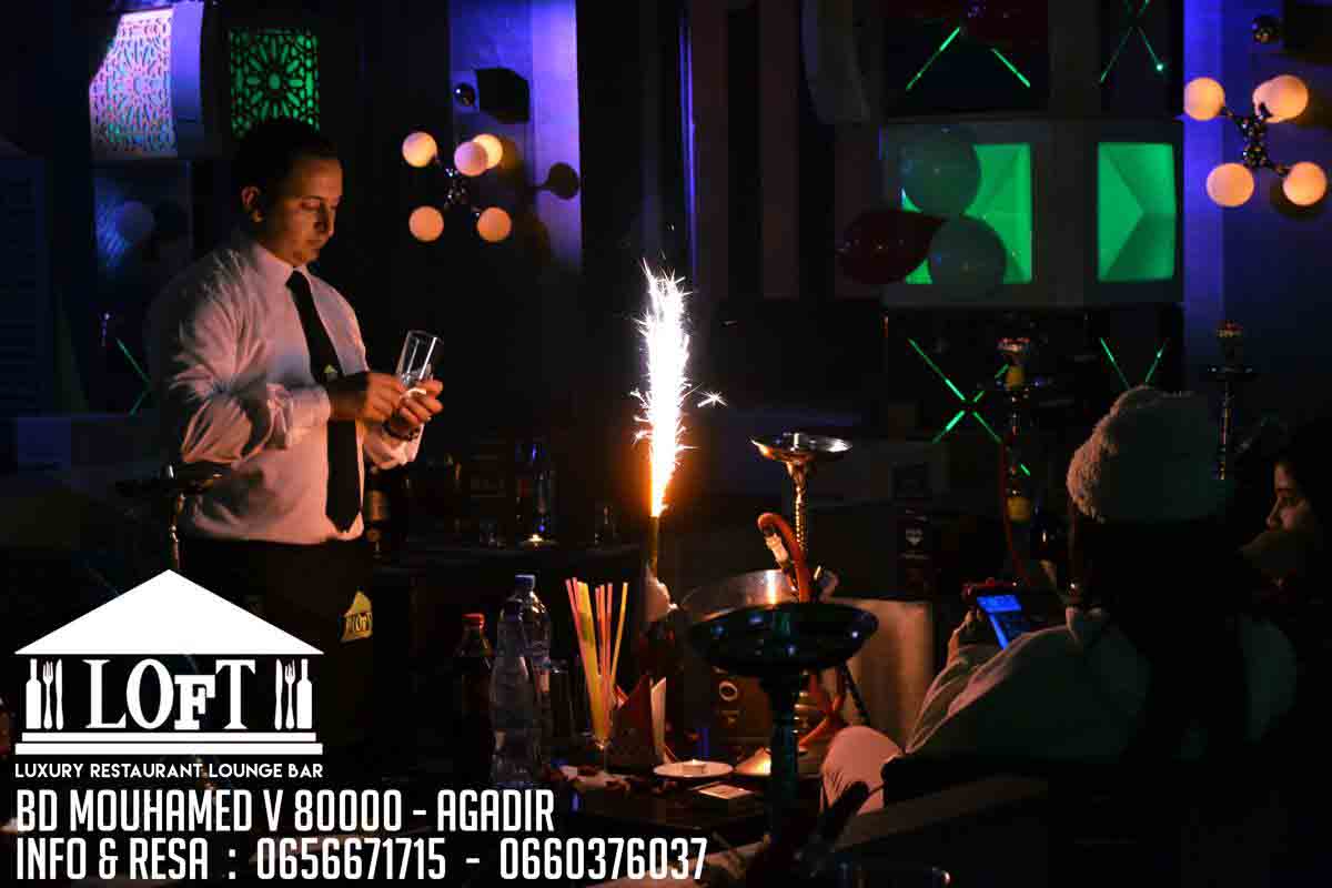 "Le LOFT" vous propose une carte éclectique allant du club sandwich au plat plus raffinée. Vous pouvez savourez à toute heure un repas au gré de vos envies et en fonction de votre appétit. Que vous souhaitiez discuter autour d'un cocktail maison ou flaner sur fond de sonorités house ... Tous les ingrédients sont réunis dans cet univers qui s'offre à vous où règne une réelle osmose entre les gens et l' on ne peut faire autrement que se sentir bien !. La terrasse cosy, chauffée bénéficiant d'une vue sur la mer d'Agadir offre un cadre parfait pour des déjeuners entre amis, en famille ou d'affaires.