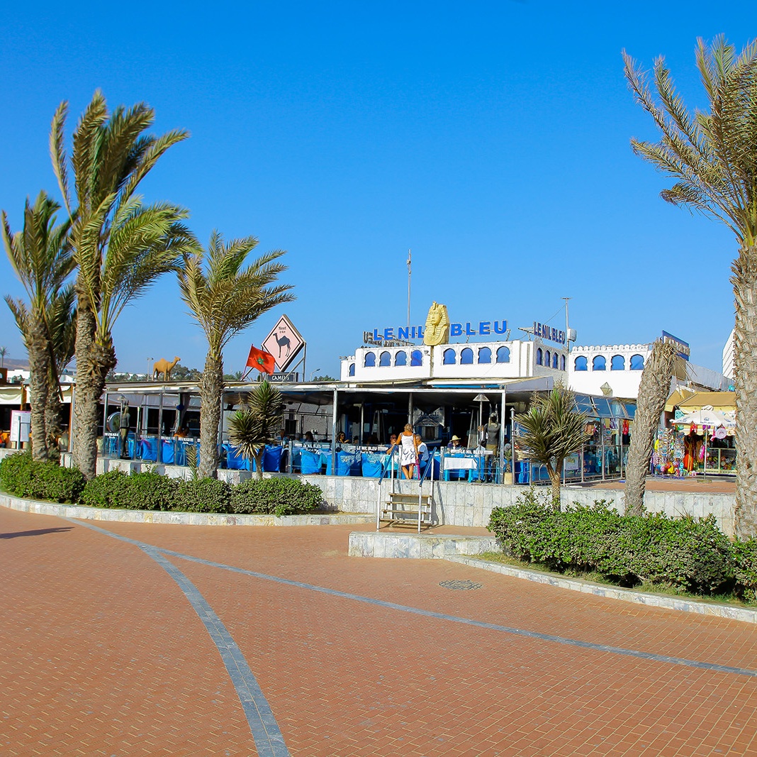 Le Nil Bleu sert des plats égyptiens mais aussi de la cuisine marocaine. Une variété de soupes de poissons et de langoustes qui sont des vrais délices. Il y a aussi des entrées chaudes et froides à base de crevettes et de poissons. Le restaurant sert également des langoustes grillées, des crevettes et une variété de plats de fruits de mer à des prix abordables. Il y a aussi des crabes, quand c’est la saison, et des huîtres.
