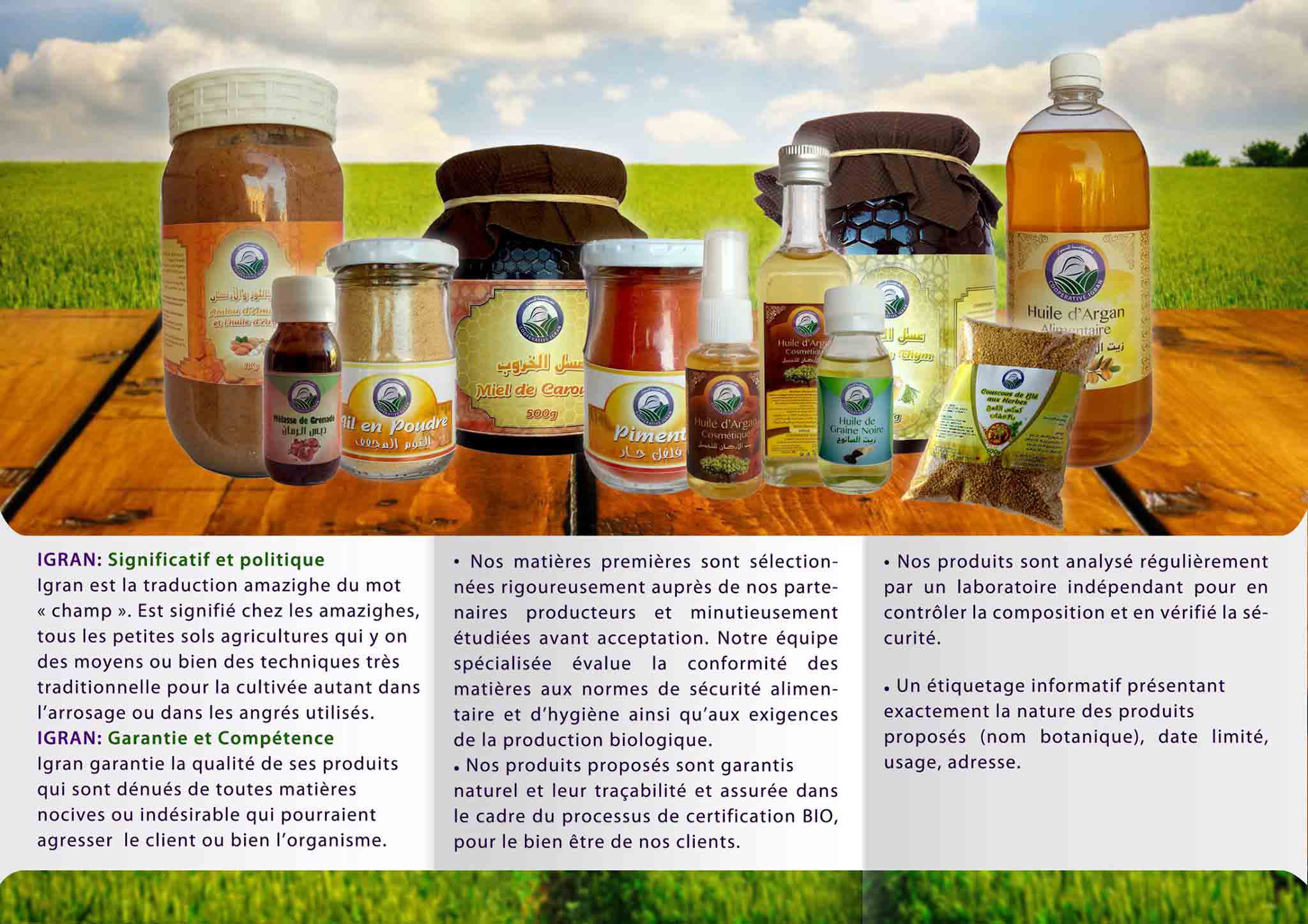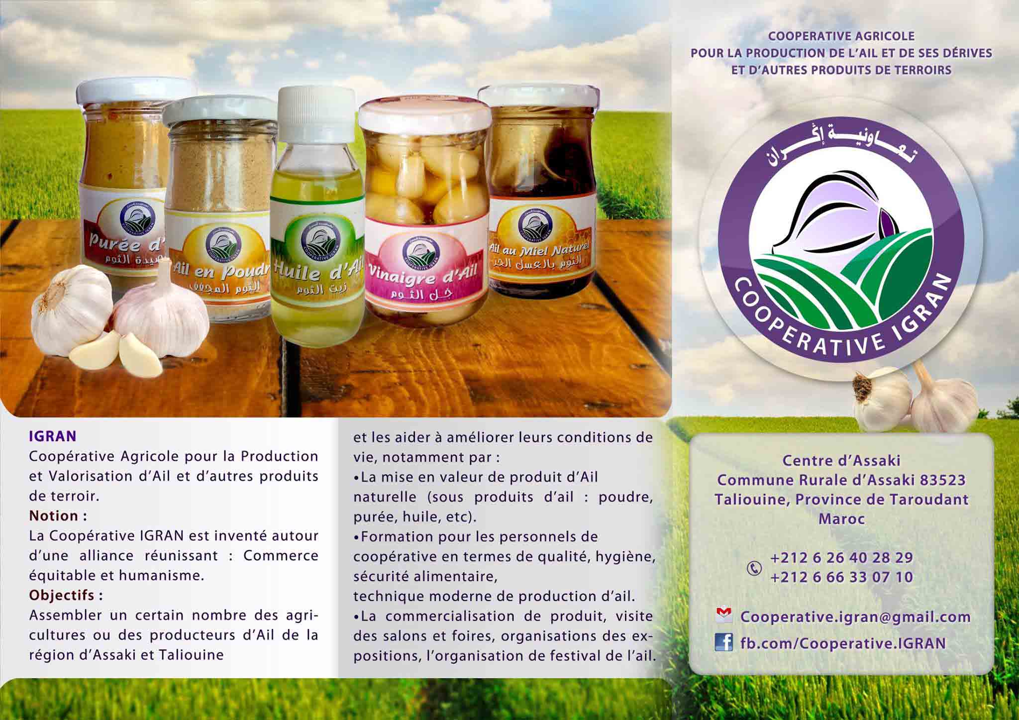La coopérative Igran est une coopérative Agricole spécialisée dans la Production et la Valorisation d'Ail et d'autres produits de terroirs. La Coopérative IGRAN est inventé autour d'une alliance réunissant Commerce équitable et humanisme. Son objectif est d'assembler un certain nombre d'agricultures ou de producteurs d'Ail de la région d'Assaki et Taliouine et les aider à améliorer leurs conditions de vie notamment par : - La mise en valeur de produit d'Ail naturel (sous produits d'ail : poudre ; purée ; huile ; etc). - Formation pour les personnels de coopérative en termes de qualité, hygiène, sécurité alimentaire, technique moderne de production d'ail. - La commercialisation de produit, visite des salons et foires, organisations des expositions, l'organisation de festival de l'ail.