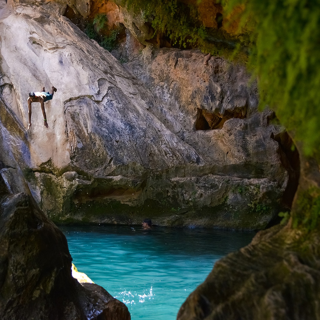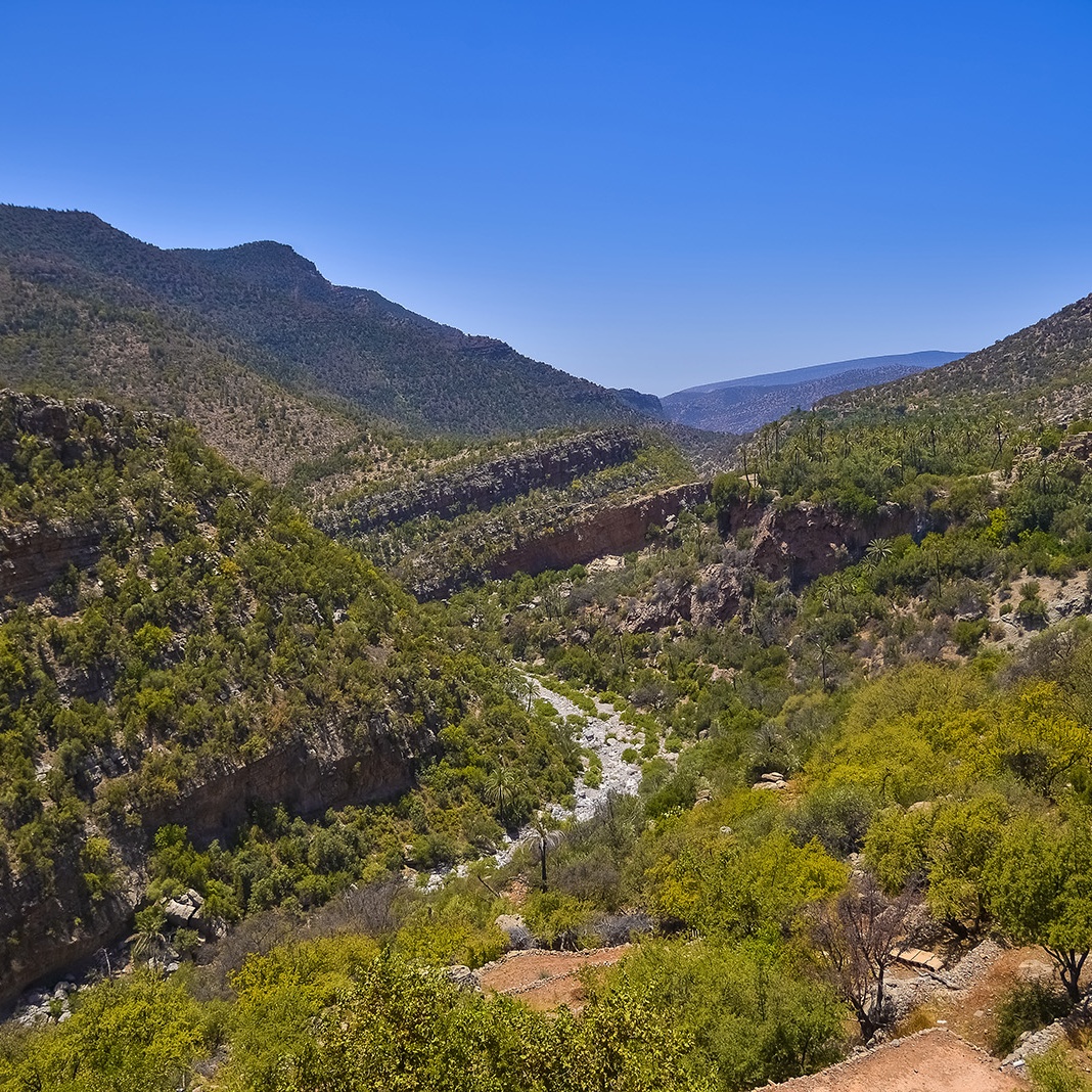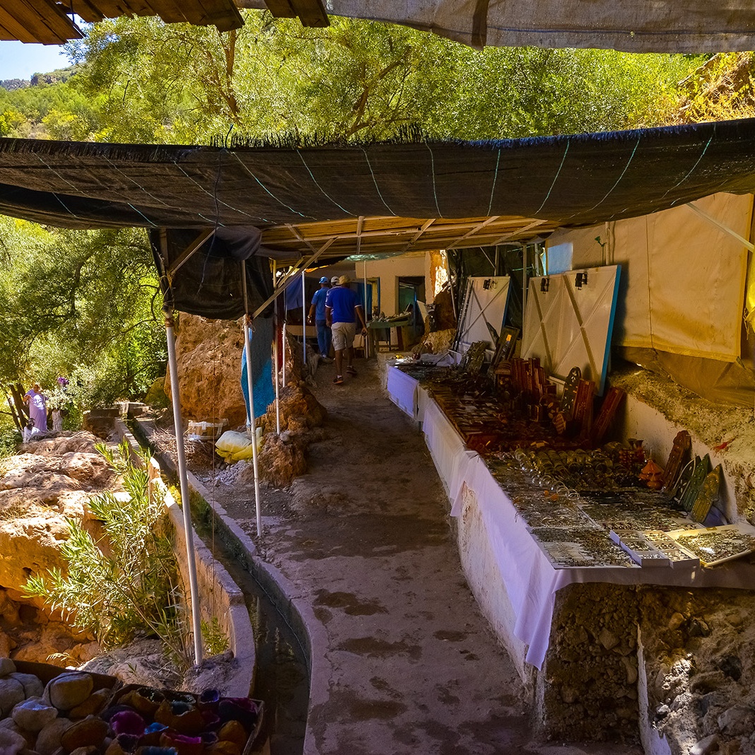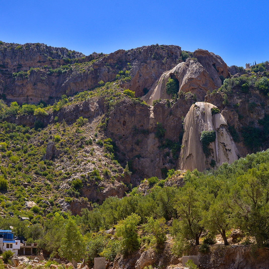 Depuis Imouzzer, une route goudronnée descend en lacet sur 4 km avant de rejoindre la palmeraie et ses cascades d'eau en activité uniquement de janvier à mars. Au niveau du guet, un chemin ombragé par les palmiers, oliviers et amandiers, serpente à travers les champs irrigués jusqu’aux cascades jaillissant sur plusieurs niveaux en s’écoulant le long des parois abruptes de la roche. La plus grande d’entre elles, lisse, est blanchie par un dépôt de roche calcaire, lui donnant son surnom de « voile de la mariée ». Les vasques naturelles, alimentées par les cascades, s’improvisent piscines aux eaux claires et bien fraîches. Parking gardé, donc payant, à l’entrée du site.