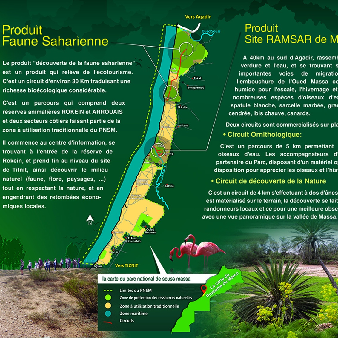 S’étendant sur plus de 33800 hectares au sud d’Agadir, le site du Parc National de Souss Massa (PNSM) représente un patrimoine national qui témoigne de la richesse d’une diversité biologique et écologique considérable. Il abrite plus de 300 espèces végétales, dont l’arganier. La faune mammalienne compte 30 espèces : le renard, le chacal, le lièvre, le chevreuil, le porc-épic et d’autres encore. Le parc compte également 250 espèces d’oiseaux, notamment l’ibis chauve, dont la colonie est la plus importante au monde. Autres habitants, les autruches à cou rouge, offrent un spectacle attendrissant. Ce vaste espace naturel, idéal pour faire une sortie en famille, vous offre des sentiers de découverte et des paysages exceptionnels: des steppes, des falaises, des dunes littorales, des zones humides, une aire d’hivernage pour un grand nombre d’oiseaux migrateurs. Tout au long des parcours, vous serez conquis par des spectacles attendrissants des antilopes, des autruches à cou rouge, des gazelles Dorcas, etc ...