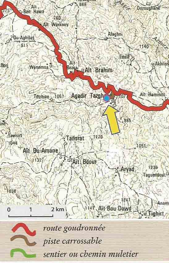 L'Agadir Tazghout contient 141 chambres en 2 étages et possède 3 tours de guet. L'accès à cet agadir se fait par la route goudronnée entre Imi Izghar et Touflaazt : 15 km après Imi Izghar. L'Agadir et situe près de la route à droite ensuite faire seulement 100 m à pied pour arriver à l'agadir.